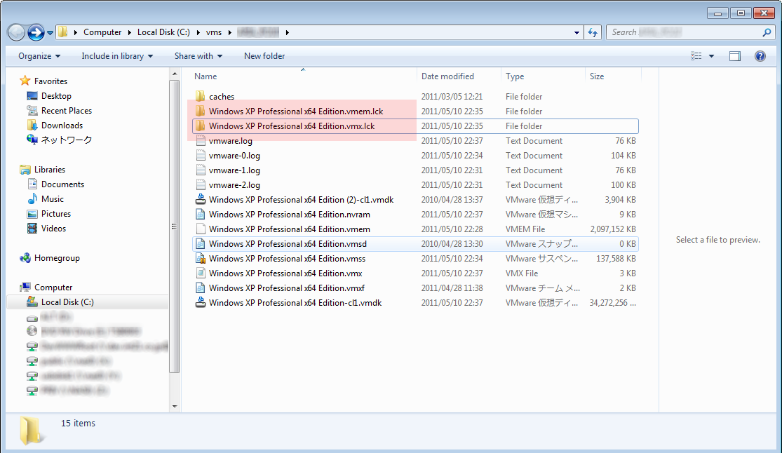 メインメモリファイル 〜 のロックに失敗しました。 ファイル 〜 から仮想マシンの状態を復元しようとしてエラーが発生しました。 と表示され、サスペンドしたVMの復帰に、毎回、かならず失敗する。 このエラーは VMware の扱うロックファイル(ディレクトリ)が消されずに残っているときに出る。問題が起きる VM のディレクトリを見ると、下記のように拡張子 .lck のディレクトリがあるはず。このディレクトリを削除してしまえば良い。 他のPCなどから、サスペンド状態のVMをコピーして持ってくると起きるようだ。 動作中の VM に .lck ディレクトリがあるのは正常。無理に削除してはいけない。